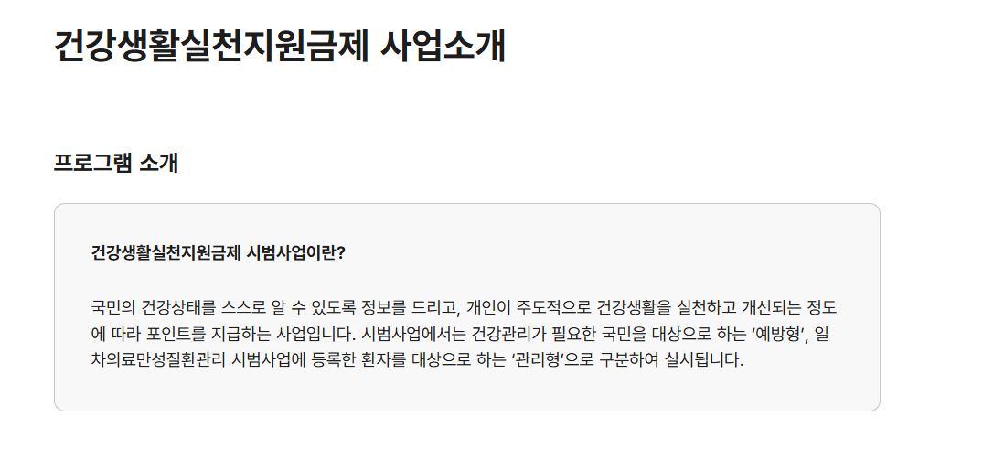 보건복지부가 주관하고 국민건강보험공단이 운영하는 이 제도는, 건강 위험 요인을 가진 국민에게 건강한 생활습관을 유도하고 그에 따른 인센티브(포인트)를 제공하는 사업입니다.
